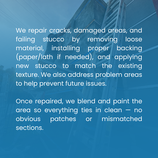 Stucco patching and crack repair done the right way before paint. We blend repairs so the surface looks uniform, not patched.